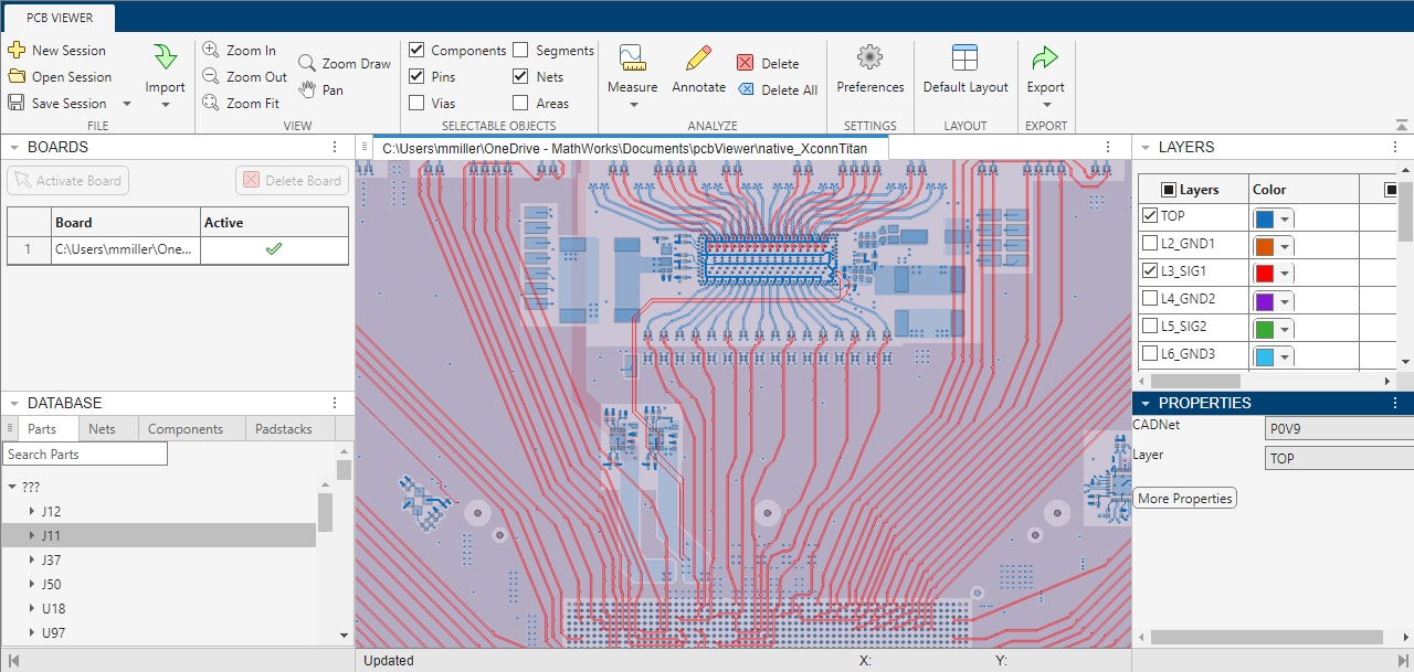 Alternatively, click on Open Session in the tool bar to open a previously saved PCB Viewer session ('.mat' file). The session PCB databases will automatically be loaded.