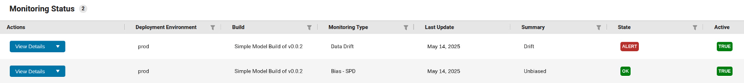 This example shows how to view the Monitoring Status of a model deployment in Modelscape. Navigate to the Model Versions page and find your required model version using the search and filter tool. Then click View Details.