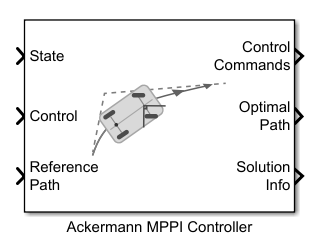 The Ackermann MPPI Controller block enables you to plan a local path for an Ackermann Kinematic Model, following a reference path typically generated by a global path planner such as RRT* or Hybrid A*, using the model predictive path integral (MPPI) algorithm.