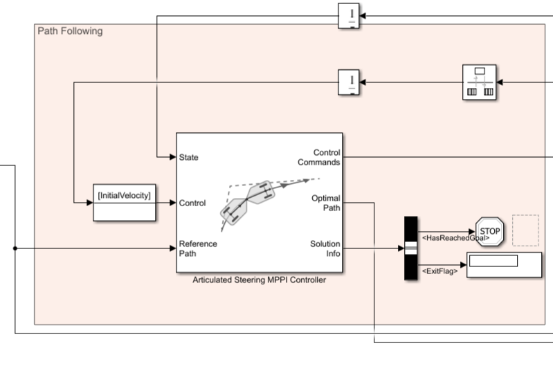 HasReachedGoalflag, output by the Articulated Steering MPPI Controller block within theSolution Infobus, indicates whether the vehicle has successfully reached the goal. This example uses this flag to stop the simulation upon reaching the goal.