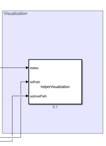 The Visualization block in the model displays the real-time motion of the vehicle as it navigates the map. It dynamically updates the vehicle's trajectory and position while overlaying the start and goal locations on the occupancy map. The visualization leverages helper functions, such as exampleHelperAnimateArticulatedVehicle and exampleHelperVehicleGeometry, to ensure accurate rendering of the vehicle's dimensions and movements.