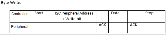 The following image shows a single byte read and write on an I2C peripheral devices.