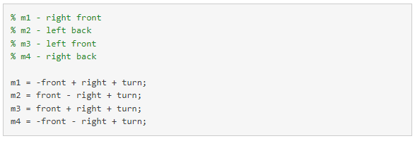 The controller outputs right, front, and turn velocities. But there are four independent motors to control.