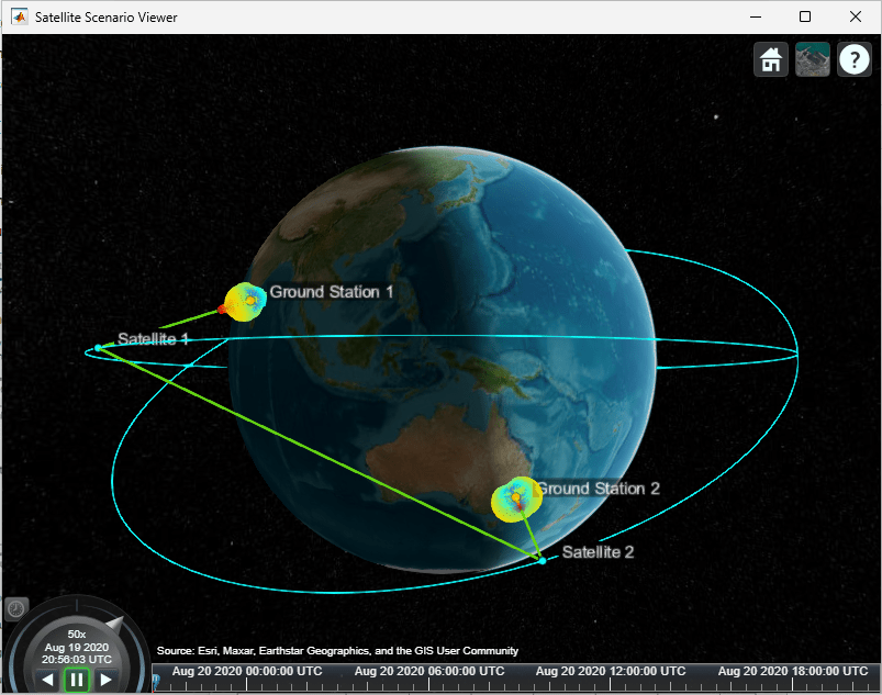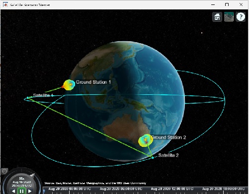 startTime = datetime(2020,8,19,20,55,0); % 19 August 2020 8:55 PM UTC stopTime = startTime + days(1); % 20 August 2020 8:55 PM UTC sampleTime = 60; % seconds sc = satelliteScenario(startTime,stopTime,sampleTime);