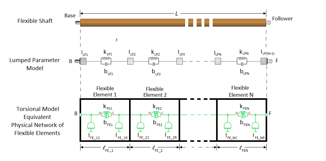 For the torsion model, the Flexible Shaft block approximates the distributed, continuous properties of a shaft by using a lumped mass method. The model contains a finite number, N, of lumped inertia-damped spring elements in series, plus a final inertia. The result is a series of inertias connected by N rotational springs and N rotational dampers.