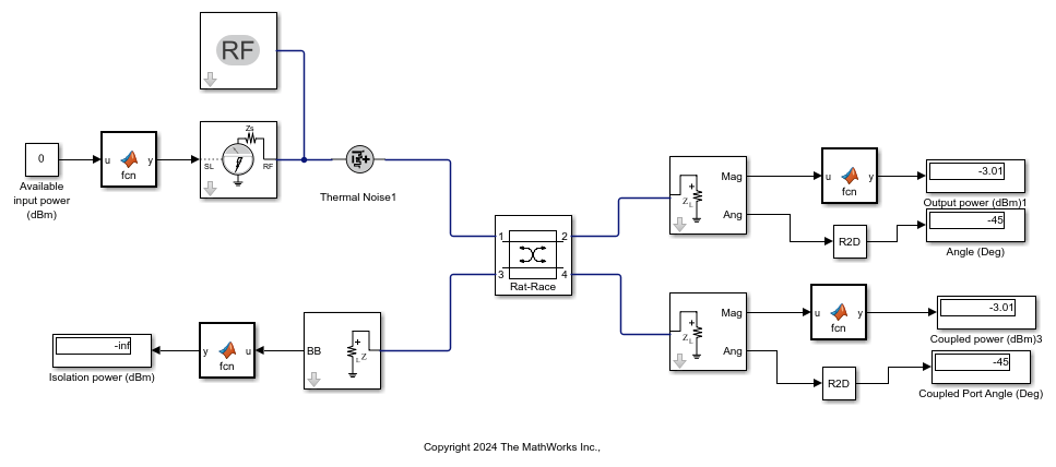 Input the rat-race coupler object to the RF PCB block to visualize and analyze the coupler in an RF Blockset circuit envelope environment. This example includes a Simulink model of a rat-race coupler designed using an RF PCB block.