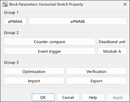 This block Horizontal Stretch shows few combinations that impact the Horizontal Stretch property. Consider these scenarios: Group 1: ePWMA: Horizontal Stretch is Off. ePWMB: Horizontal Stretch is On.