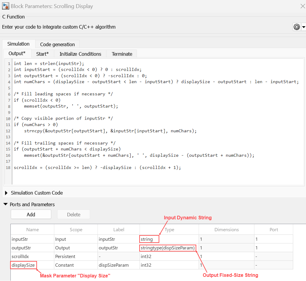 This block interprets a Simulink® string of length n as a C character array of length of n+1. The Buffer size of dynamically-sized string (bytes) parameter under Advanced parameters section of Simulation Target pane of Configuration Parameters dialog box determines number of character buffer generated for dynamic string signals. This allows the C Function block to use string library functions and zero-based indexing to output a fixed-size Simulink® string with a scrolling effect.