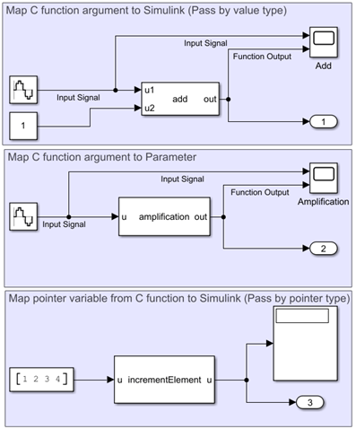 This example shows how to map custom C functions into Simulink® using C Caller blocks. In this example, three C Caller blocks call three different custom C functions that perform various arithmetic operations and follow different mapping strategies. The example model CCallerExample is divided into three components: