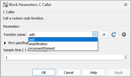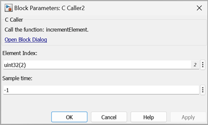 Open the In the C Caller Block Parameters dialog box and observe that the Function name field specifies