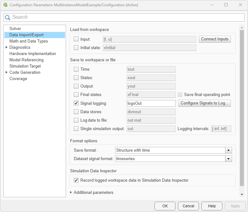 On the Data Import/Export pane, click Configure Signals to Log. The Simulink Signal Logging Selector dialog box opens.