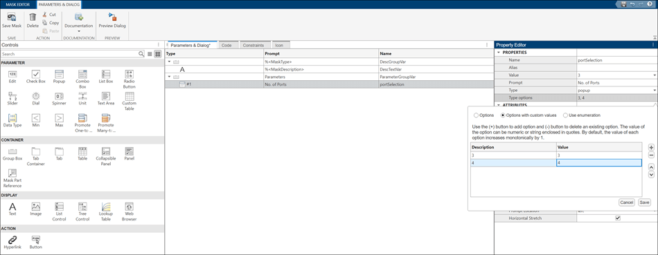 Consider a masked Subsystem block with the popup parameter set to portSelection with the prompt No.of Ports. The block icon changes based on the value you select for No. of Ports in the Block Parameters dialog box. If you specify the No. of Ports as 3, an image of a three-switch port appears on the block icon. If you specify No. of Ports as 4, an image of a four-switch port appears on the block icon.