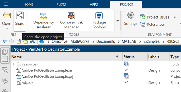Use a project to export an FMU. Open the model and select New > Project > New Project from this Model to create a project from a model. This example uses the vdp model.