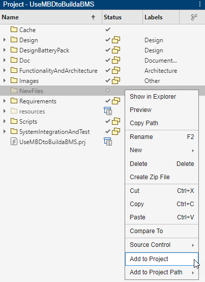 Code,Requirements,Integrationetc, and so forth.To add files and folders to project path, in the Project panel, right-click the file or folder and select Add to Project Path.