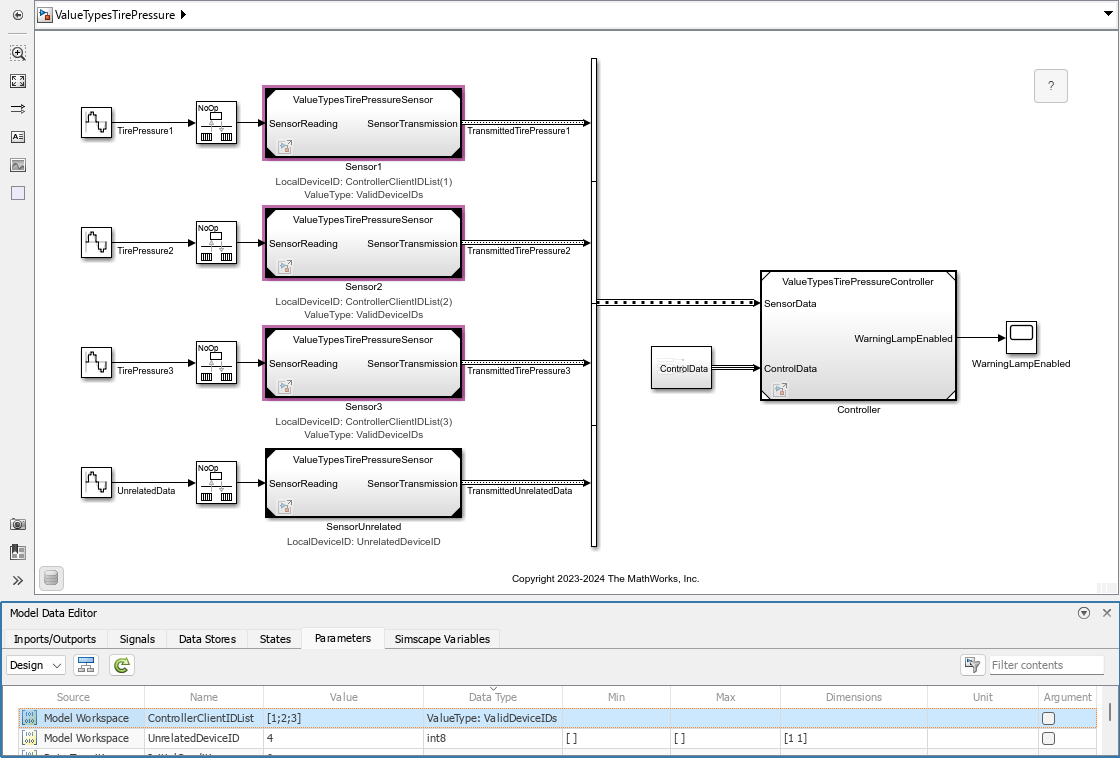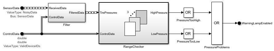 The ValueTypesTirePressure project defines a model hierarchy that determines whether the tire pressures of a three-wheeled vehicle are within the intended operating range. Each sensor transmits tire pressure data mapped to a unique sensor ID. Of the four sensors in the model, only three of the sensors measure the tire pressure of the target vehicle. A controller filters out the unrelated sensor and determines whether the vehicle tire pressures are acceptable. When a tire pressure is out of range, the controller enables a warning lamp.