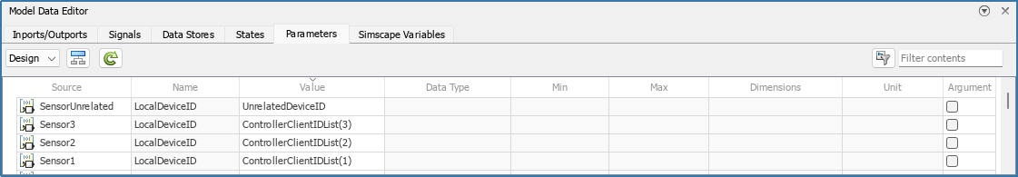 To view how the Model blocks use the ControllerClientIDList parameter object, in the Model Data Editor, sort the Value column by clicking the column heading.