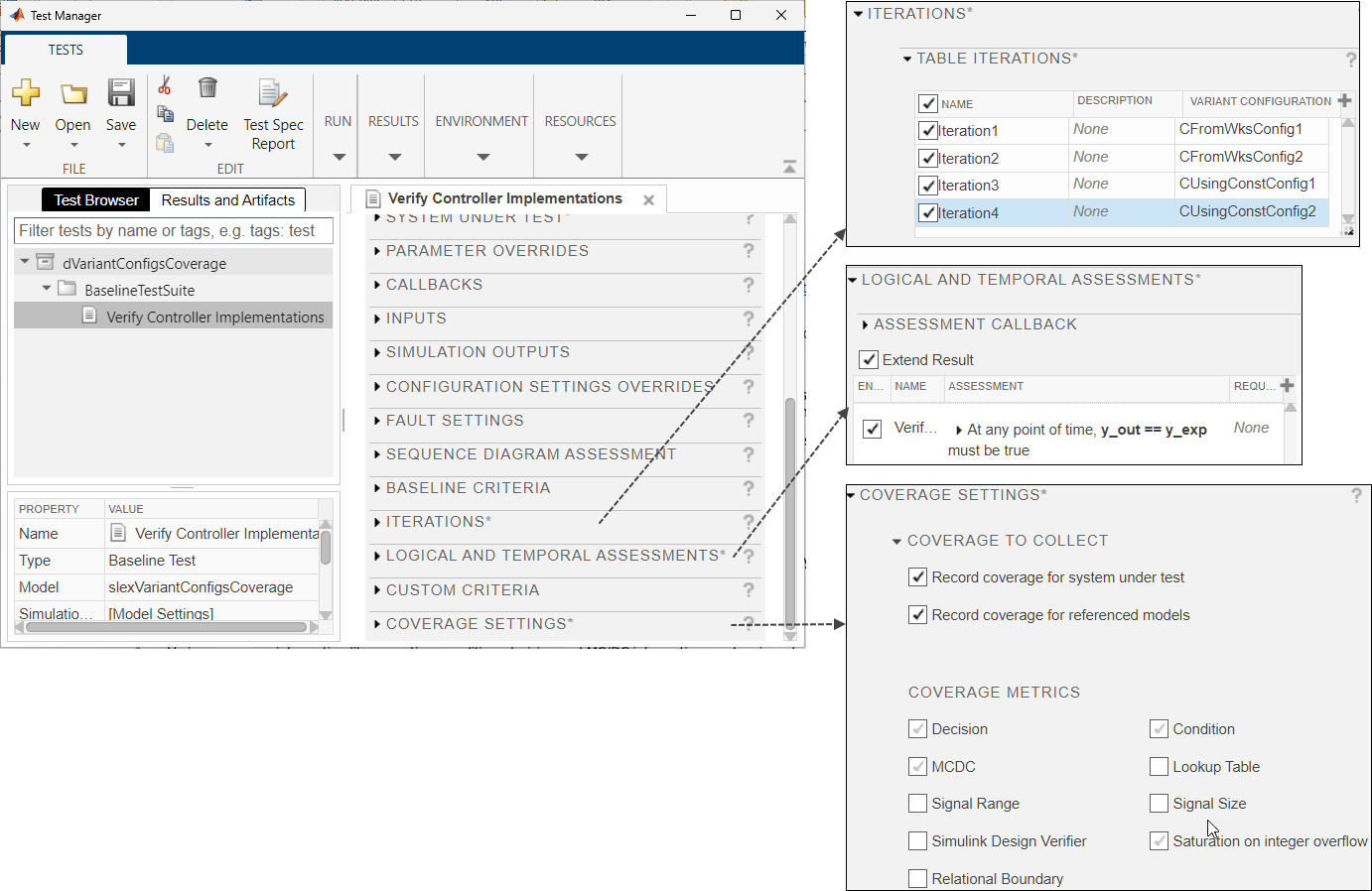 The test case sets up four iterations, each using one of the four predefined variant configurations. The test case enables coverage collection and selects the necessary metrics. Additionally, the test case verifies that y_out, the output of the Logical Controller block, matches y_exp, the output of the Logic Verifier block throughout the simulation.