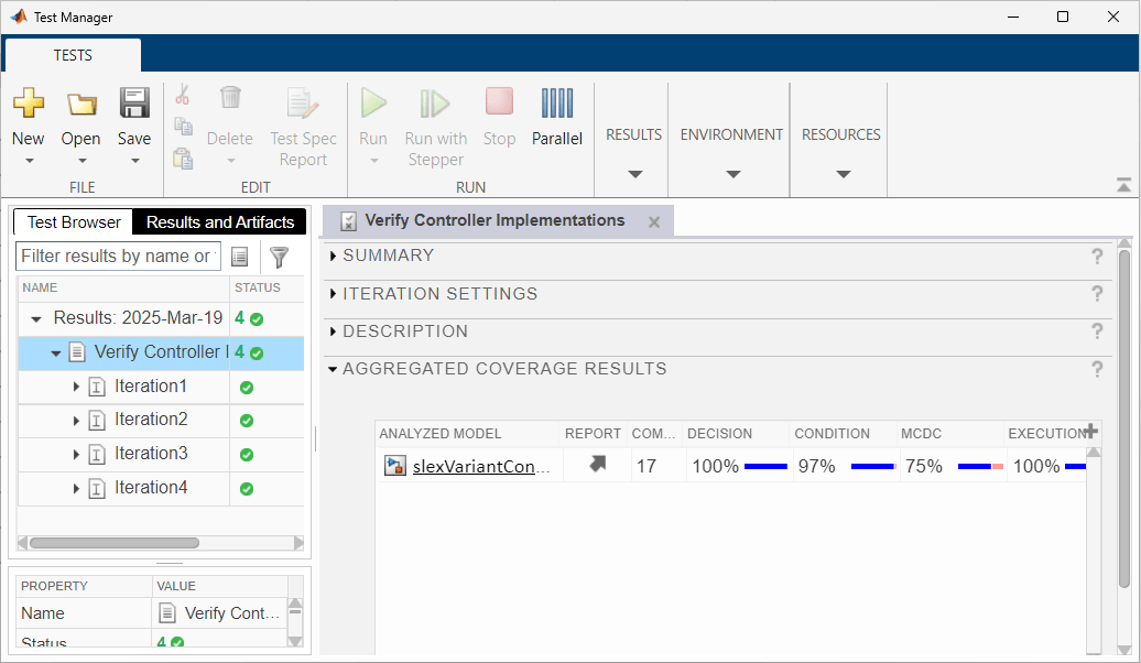 In the Test Manager, you can run individual tests or entire test suites. In the Test Browser pane, select the test case Verify Controller Implementations. In the Simulink Test Manager toolstrip, click Run to execute the test case.