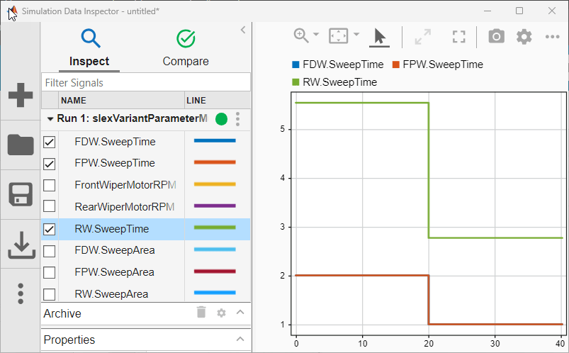 SweepTimeandSweepAreaparameters for the front driver, front passenger, and rear wipers of the car by providing the corresponding wiper motor speed as input to three instances of theslexVariantParameterWipermodel.