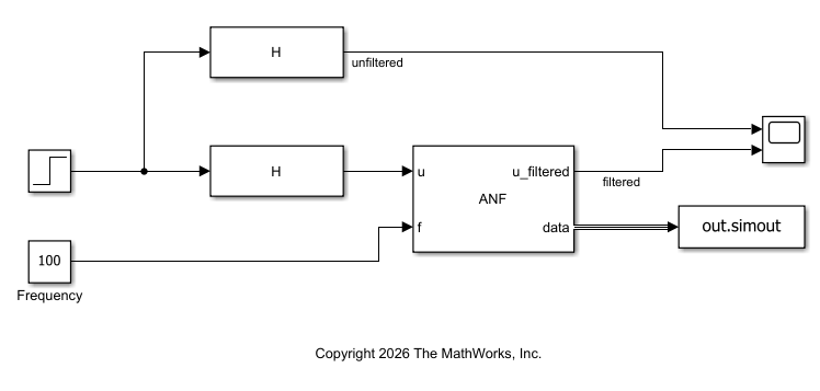 The model is configured to simulate a step response of the filtered and unfiltered plant output. In this configuration, the input u of the ANF block is connected to the signal you want to filter and f is connected to the frequency at which the resonance occurs. Open the model.