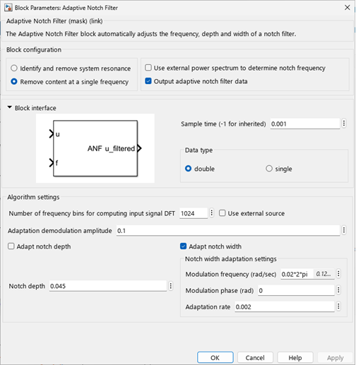 The block in this model adapts both the notch depth and width based on the identified resonance. The following image shows how the block is configured.