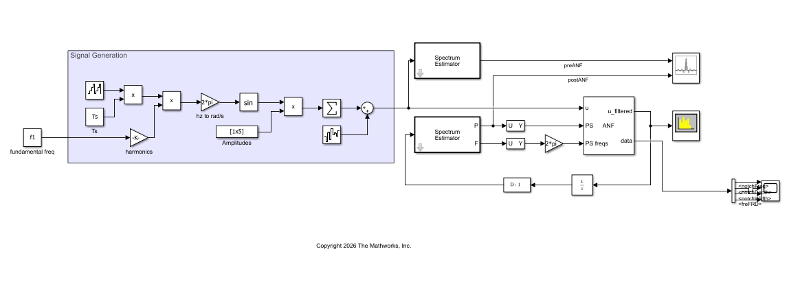 This example shows how to filter a harmonic using the Adaptive Notch Filter (ANF) block based on a power spectrum of the signal to filter. The Simulink® model anfHarmonics.slx, provided with this example, shows the simplest way you can use the ANF block to filter harmonics based on the power spectrum input. The generates harmonics applied to a fundamental frequency and filters out the third harmonic.