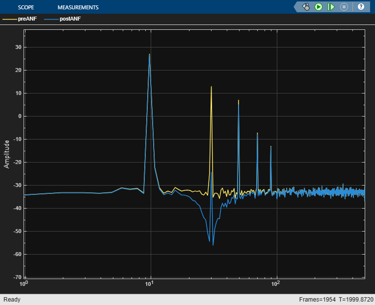 This example shows how to configure the Adaptive Notch Filter (ANF) block to perform filtering based on a power spectrum of the signal to filter. In this mode, the block continuously adapts the notch width and depth parameters based on the power spectrum of the signal. This is helpful when you have a power spectrum from an external source, such as a Spectrum Estimator block, and want to continuously perform filtering.