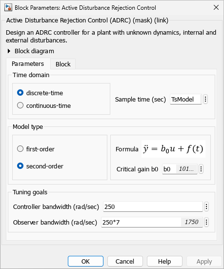 Additionally, you also specify the Time domain parameter to match the time domain of the plant model. In this example, time domain is set to discrete-time and with a sample time of 1e-4 seconds. The following sections describe how to find the remaining tuning parameters specified in the ADRC block parameters for this model.