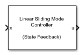 Use the Linear Sliding Mode Controller (State Feedback) block to implement Sliding Mode Control (SMC) based on a class of uncertain linear systems using a state feedback approach. This block offers the major benefit of providing two methods to automatically design the sliding surface based on a linear plant model. You can use the Sliding Mode Controller (Reaching Law) block to support a generic nonlinear plant model (), though you need to design the sliding surface C yourself. In contrast, with the Linear Sliding Mode Controller (State Feedback) block, which is based on a nominal linear plant model, you can automatically design the sliding surface using the provided methods.