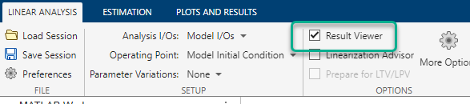 If you do not check Result Viewer, or if you close the result viewer, you can open the result viewer for a previously linearized model. To do so, in the Plots and Results tab, select the linear model in the Linear Analysis Workspace, and click
