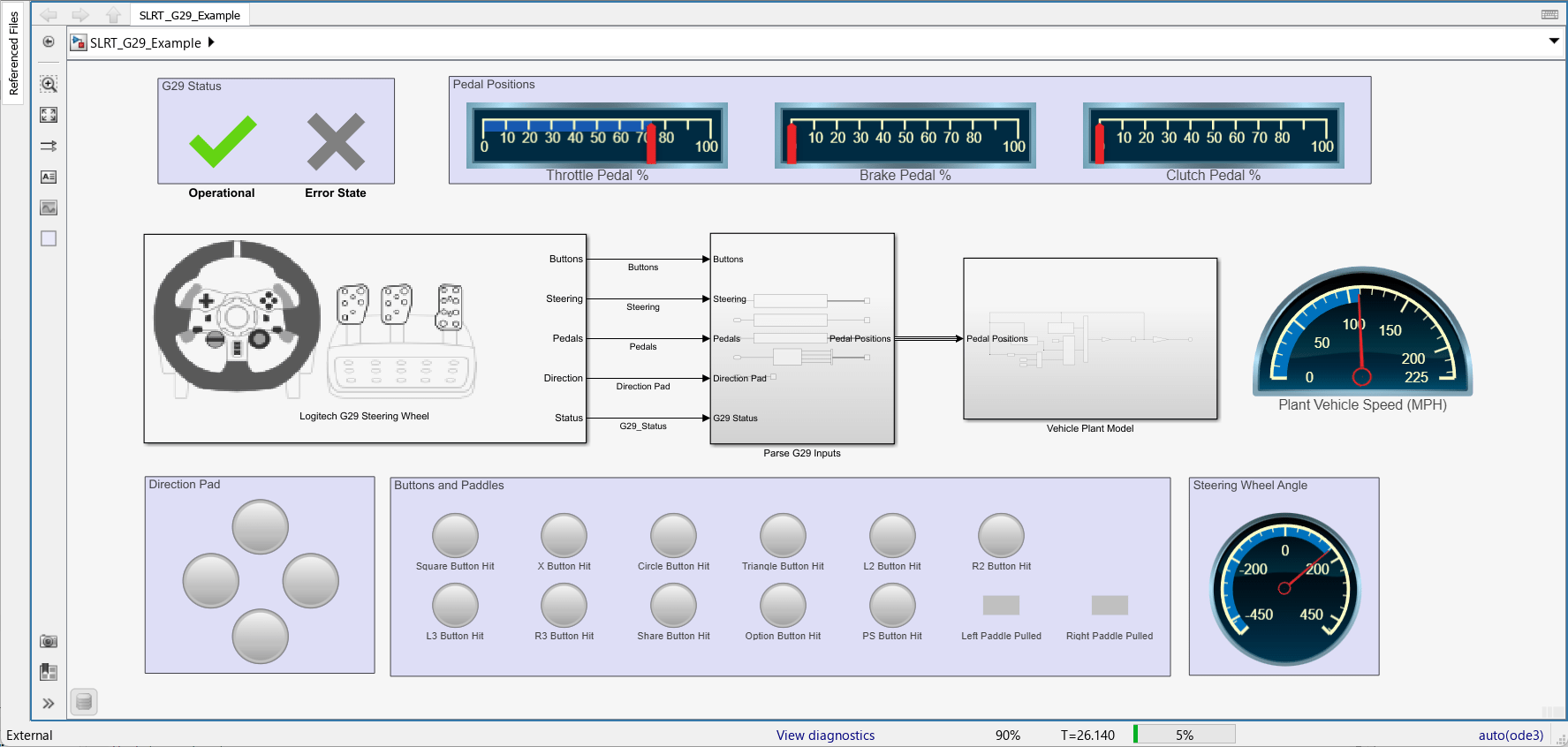 This example shows how to configure and use a Logitech G29 Steering Wheel block. This reads inputs from a Logitech G29 Steering Wheel device that is connected to the target computer.