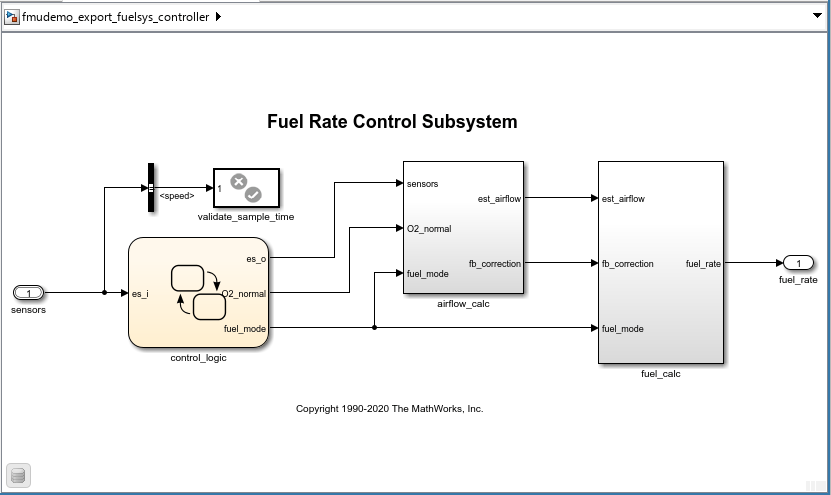 This example uses the fmudemo_export_fuelsys_controller model that controls the fuel rate by using signals from the system sensors to determine the fuel rate that gives a stoichiometric mixture. It then uses sensor inputs and feedback signals to adjust the fuel rate to give a stoichiometric ratio. The model uses three subsystems to implement this strategy: one for control logic, one for airflow calculation, and one for fuel calculation. Under normal operation, the model estimates the airflow rate and multiplies the estimate by the reciprocal of the desired ratio to give the fuel rate. Feedback from the oxygen sensor provides a closed-loop adjustment of the rate estimation to maintain the ideal mixture ratio.