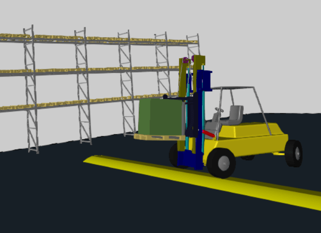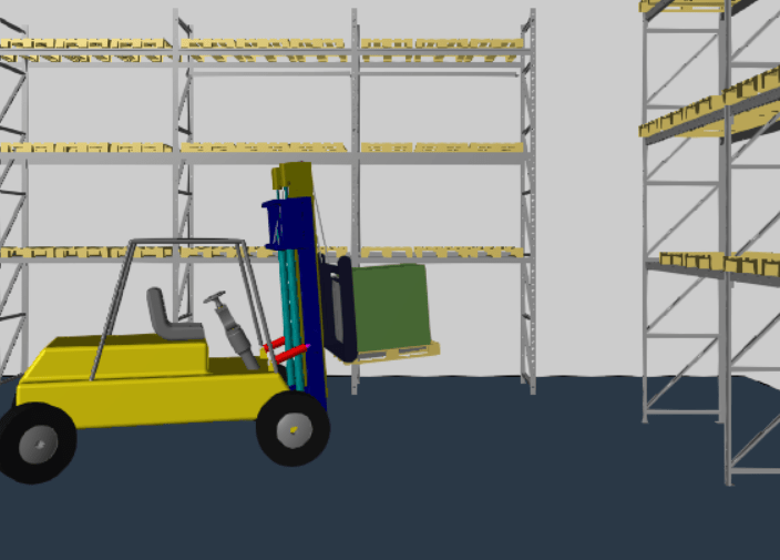 This example shows how to create dynamic cameras for a multibody model. You create two types of dynamic cameras to view an operating forklift. The first camera uses the tracking mode to show the perspective of a driver, and the second relies on several specified keyframes.
