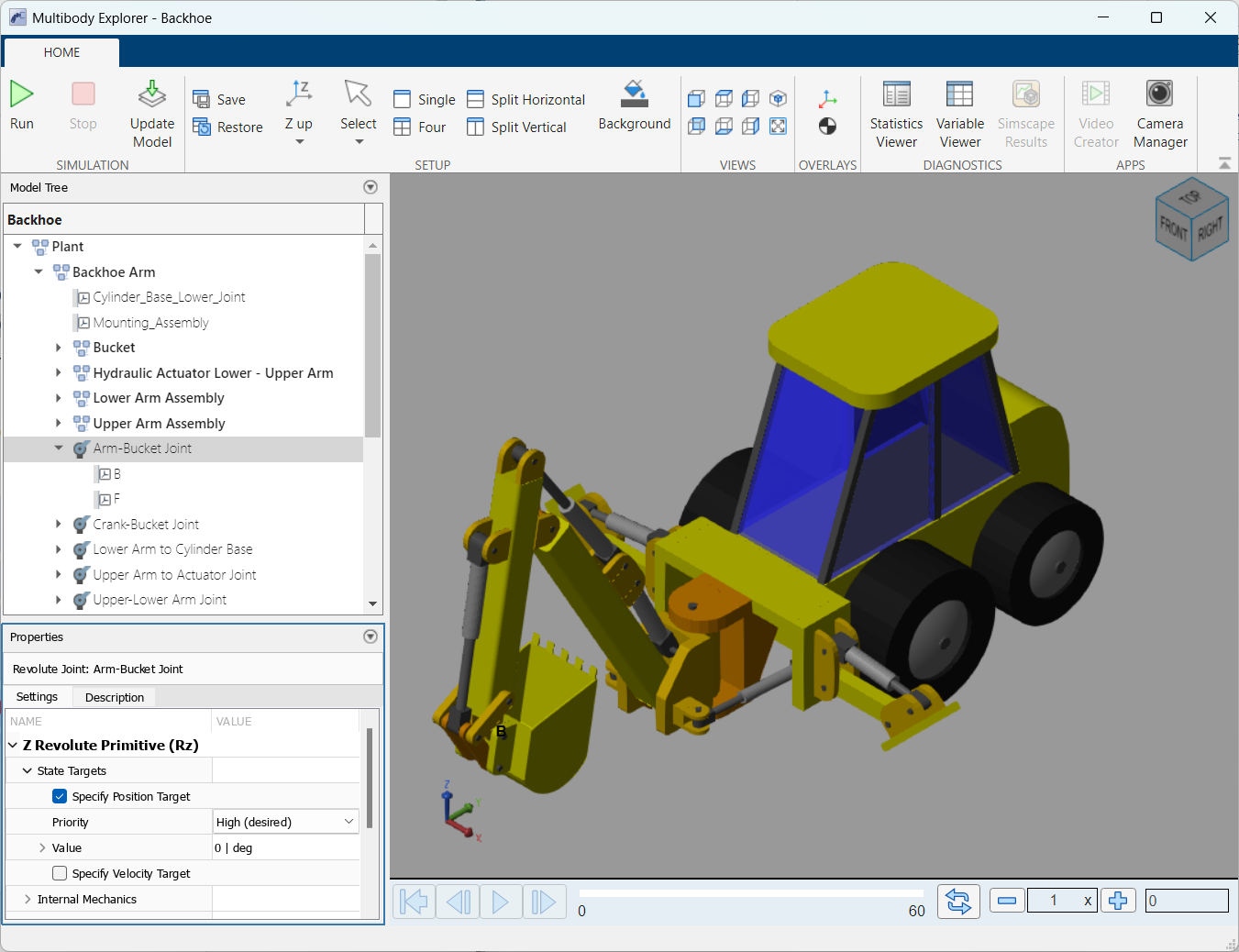 Use the Multibody Explorer tool to interactively visualize and explore multibody models. The tool consists of the Model Tree pane, the Properties pane, and a visualization pane.