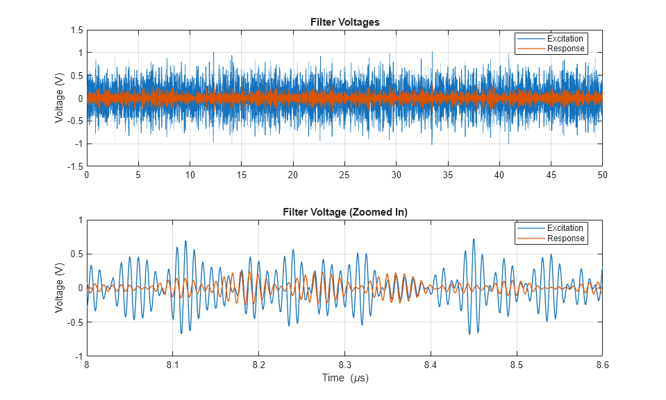 The plot below shows the excitation voltage and the response of the bandpass filter circuit. A band-limited noise source is up-shifted by a 100MHz oscillator and applied to the filter. The response is then down-shifted by the oscillator.
