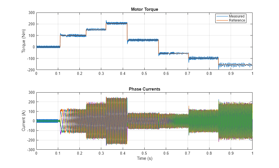 This example shows how to control the torque in an electrical-traction drive based on a five-phase permanent magnet synchronous machine (PMSM). A DC voltage source feeds the PMSM through a controlled five-phase converter. The PMSM operates in both motoring and generating modes according to the load. An ideal angular velocity source provides the load. The Control subsystem uses an open-loop approach to control the PMSM torque and a closed-loop approach to control the current. At each sample instant, the torque request is converted to a relevant q-axis current reference. The current control is PI-based. The simulation uses several torque steps in both motor and generator modes. The Scopes subsystem contains scopes that allow you to see the simulation results.