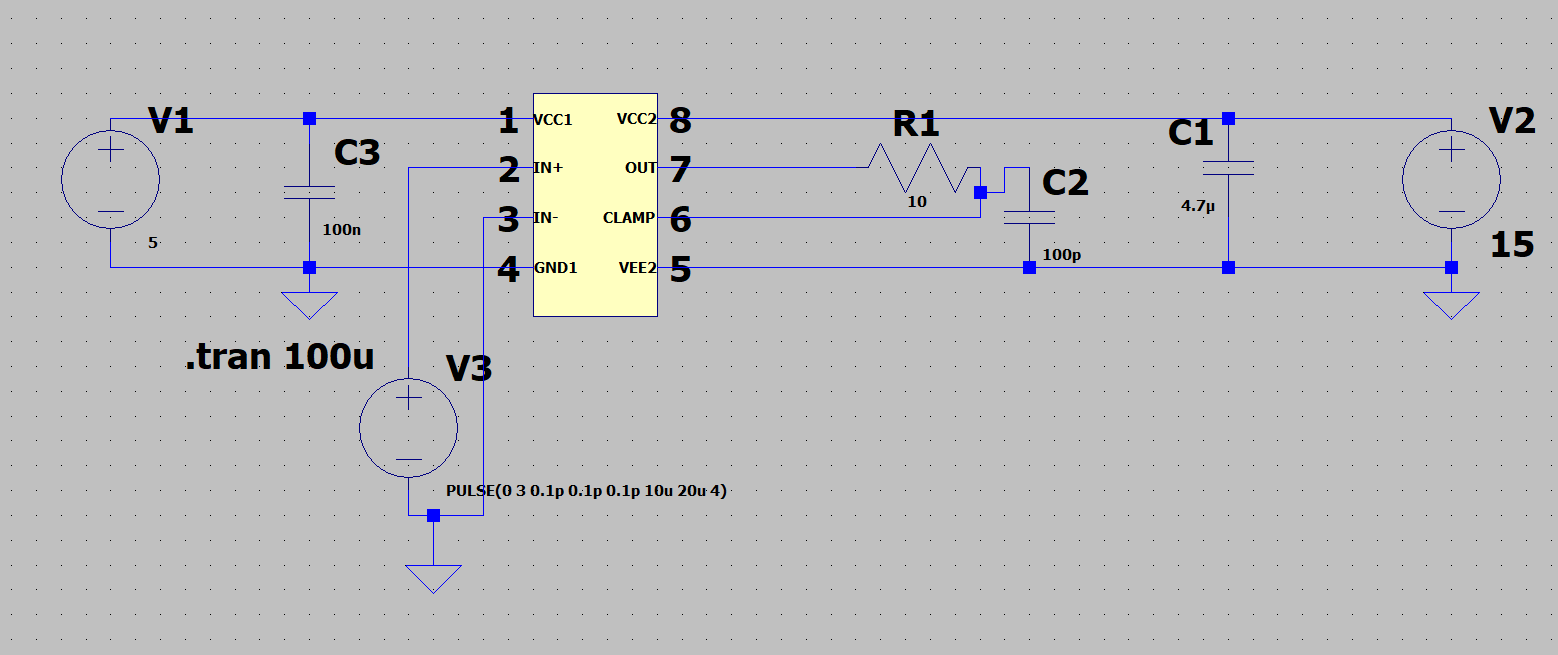 This figure shows the test harness circuit of the gate driver with bipolar output voltage: