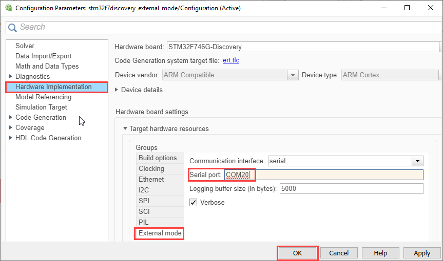For STM32F746G-Discovery or STM32F769I-Discovery, in Configuration Parameters > Hardware Implementation > Target Hardware Resources > PIL > COM Port enter the COM port of the serial interface on Windows®. Follow steps 3 and 4 to configure the COM port.
