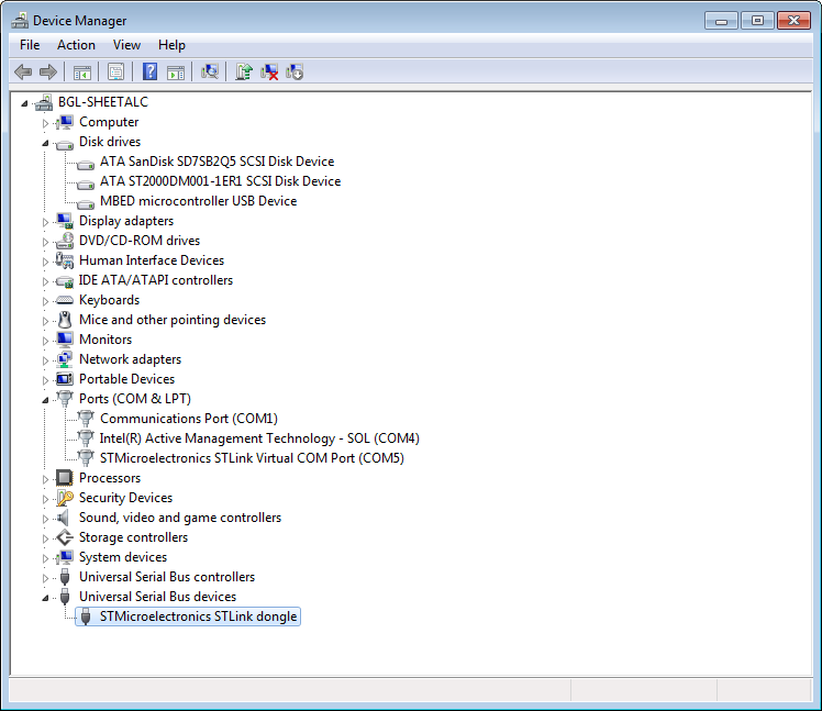 After the driver is detected, you see the STMicroelectronics STLink dongle under the Universal Serial Bus devices as shown.