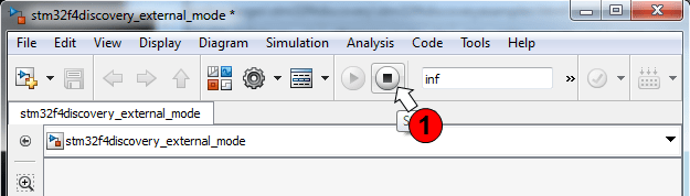 Stopping the External mode simulation terminates the execution of the code running on the STM32F4-Discovery board.