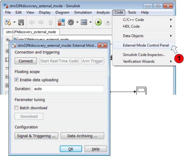 Note: At any point during the course of the External mode simulation, you can open the External Mode Control Panel (Simulink Coder), as shown. The External mode control panel provides more options, such as the ability to connect and disconnect to the target without terminating the execution of the generated code.