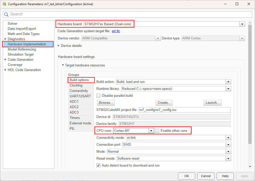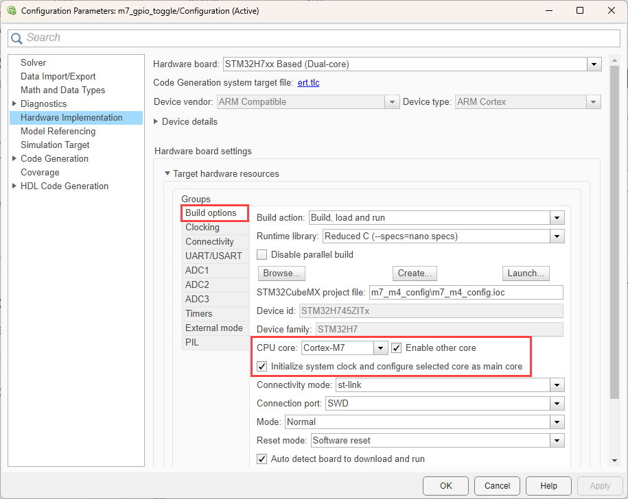 • Configure Simulink model using both cores together (Cortex-M7 as primary core and Cortex-M4 as the secondary core).
