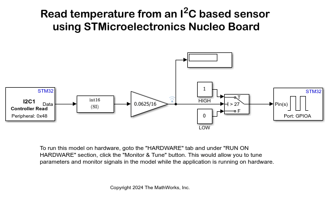 This example shows how to use the STM32™ Microcontroller Blockset for configuring and reading data from an I2C-based sensor using an STMicroelectronics® Nucleo board.