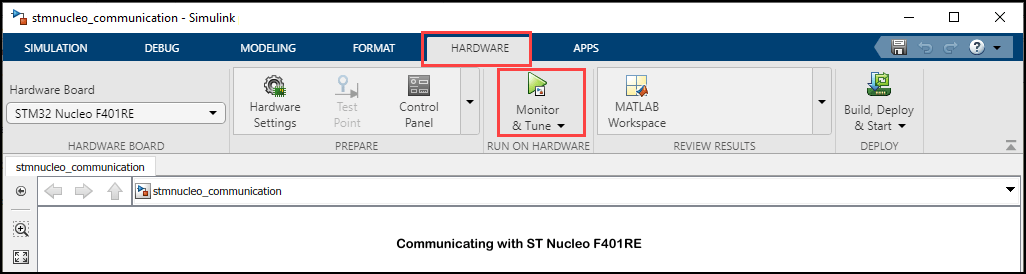 The model provided is pre-configured for STMicroelectronics Nucleo F401RE board. You can configure this model for other supported Nucleo boards by browsing to Configuration Parameters > Hardware Implementation > Hardware board and selecting the required board.