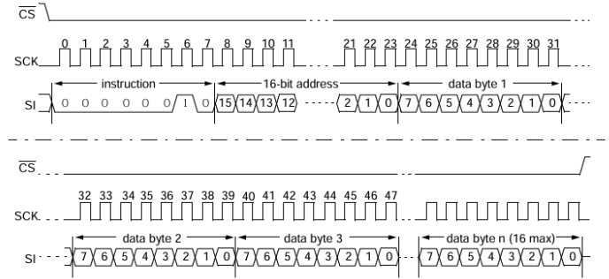 Drive CS line low > Send 0x02 (WRITE) > Send 16-bit Address > Send Data (Max 16 bytes) > Drive CS line high after data byte is transferred