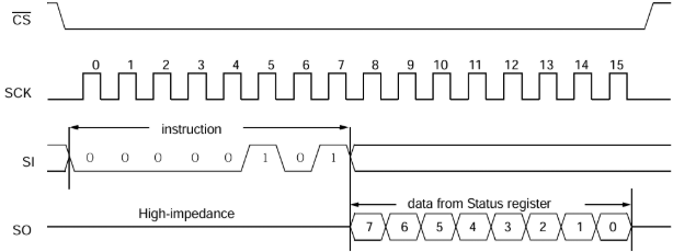 0x05(RDSR) → Send a dummy byte (0x00) to read the 8-bit register value.Check bit 0 (WIP). A value of 1, indicates Busy (the write is in progress). A value of 0, indicates Ready (the write is complete).