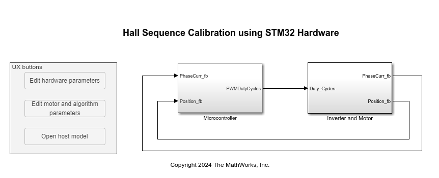 The example supports these hardware configuration. You can also use the target model name to open the model for the corresponding hardware configuration, from the MATLAB® command prompt. STM32G431RB Nucleo Board + X-Nucleo-IHM08M1 inverter: stm32_hall_sequence_calibration_target.slx