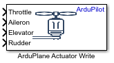 The ArduPlane Actuator Write block writes motor and servo actuator values