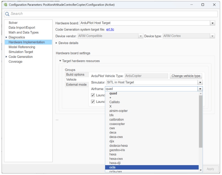 The example model is already configured for the ArduPilot Host target, which enables Software-In-the-Loop (SITL) simulation for ArduPilot. You can now run the model directly in Monitor & Tune mode to test and tune your algorithms in real time.