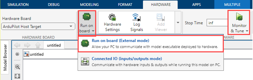 On the Hardware tab, in the Mode section, click Run on board and then select Run on board (External mode). If you see Connected IO selected instead of Run on board, click on it and choose Run on board (External mode).